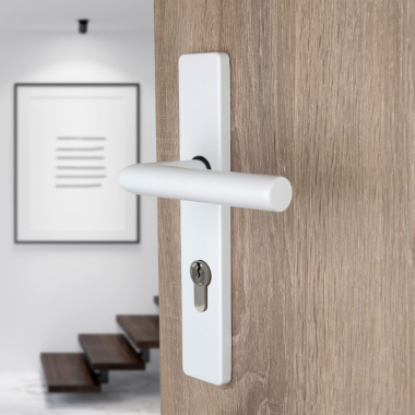 La poignée EDISON sur plaque carrée en acier finition blanc mat avec trou de cylindre est conçue pour les portes d’entrée, associant sécurité et esthétique contemporaine. Ses lignes droites et équilibrées apportent une touche sobre et élégante à votre façade, idéale pour un habitat moderne ou plus classique.