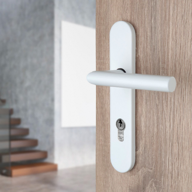 La poignée EDISON sur plaque ronde en acier finition blanc mat avec trou de cylindre est spécialement conçue pour équiper les portes d’entrée. Elle associe sécurité et esthétisme grâce à son design sobre et contemporain, apportant une note lumineuse et élégante à votre façade.