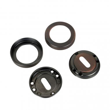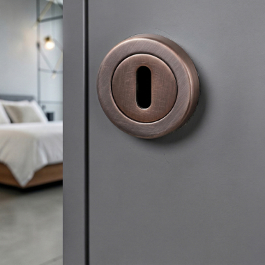 Accueil > 2 rosaces de poignée de porte rondes ISOLA entrée de clé, Zamak aspect cuivre