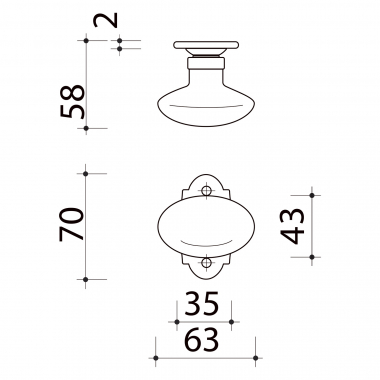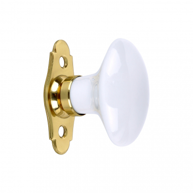 Bouton de fenêtre en porcelaine blanche, avec embase et platine en laiton finition poli, modèle OLIVE.