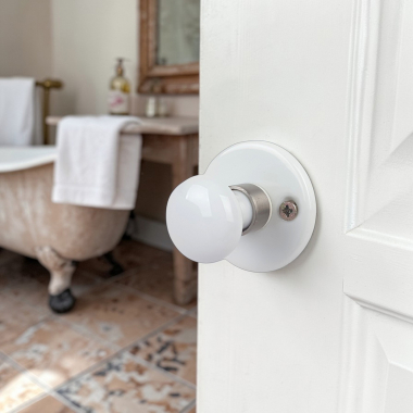 Bouton porte ROND, en porcelaine blanche, finition Poli, fourni sans plaque ni rosace.