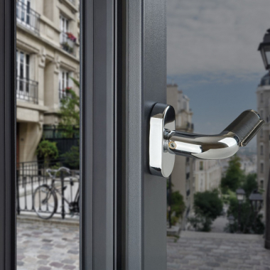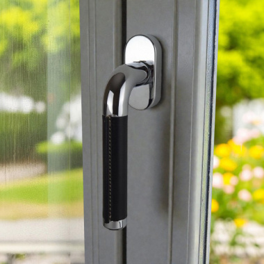 Poignée de fenêtre TEXAS, Laiton chromé et cuir noir