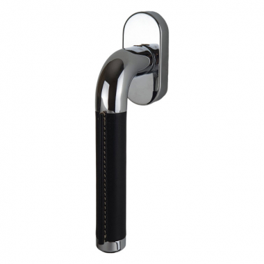 Poignée de fenêtre Texas en laiton chromé, et en cuir noir.