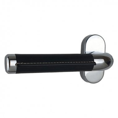 1/2 poignée de porte intérieure réversible design en laiton chromé et cuir noir sur plaque Clé L entraxe 195 mm, TEXAS