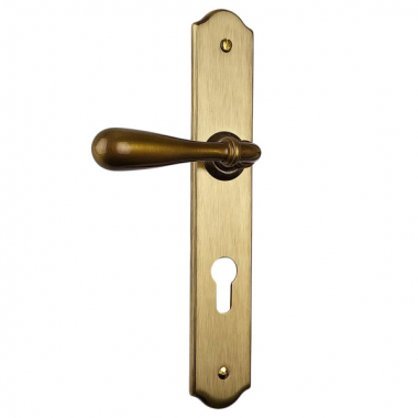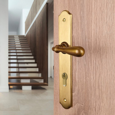 Poignée de porte intérieure en laiton patiné sur plaque Clé L entraxe 195 mm, DURANCE