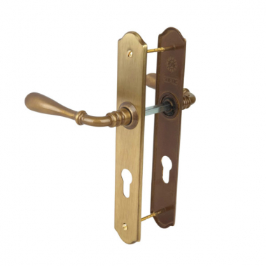 Poignée de porte d'entrée en laiton patiné sur plaque Clé I entraxe 195 mm, DURANCE