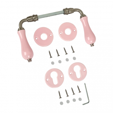 Garniture de porte complète ou ensemble de 2 poignées de porte en Porcelaine rose, sur rosace ronde livrée avec paire de rosaces de fonction cylindre pour serrure de porte d'entrée.