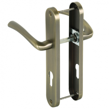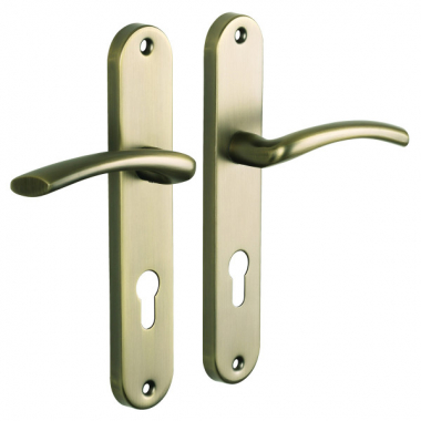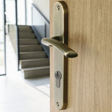 Garniture sur plaque ou ensemble de 2 poignées de porte en métal finition aspect laiton brossé mat sur plaque fonction Clé I pour porte extérieure ou de bureau.